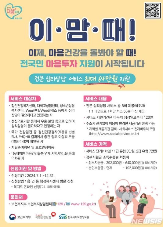 ‘전국민 마음투자 지원사업’은 우울·불안, 이상동기 범죄 등 정신건강 문제가 날로 심각해지는 현실을 반영하여, 정신건강에 어려움을 겪는 전 국민이 전문 심리상담 서비스를 받을 수 있도록 지원하는 사업이다.