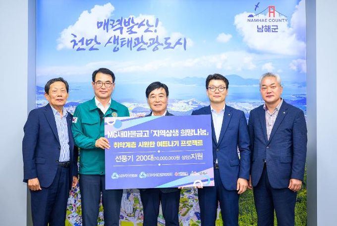 [경남도민뉴스] 남해군은 지난 16일 MG새마을금고 중앙회 울산경남지역 강상수 본부장, 미송새마을금고 김정화 이사장, 새남해새마을금고 하영종 이사장, 창선새마을금고 양철용 이사장이 군수실을 방문하여 1천만원 상당의 선풍기 200대를 기탁했다고 밝혔다.