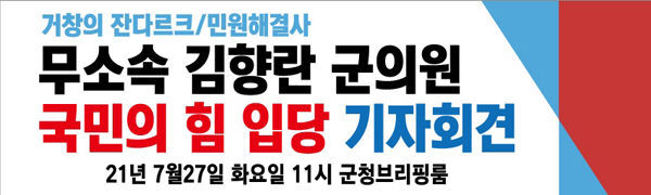 [경남도민뉴스] 무소속 김향란 군의원이 “국민의 힘” 입당을 선언하며 함께해야 내년 김태호 대통령만들기라는 긴 여정을 완수 할 수 있을 것이라고 밝혔다.