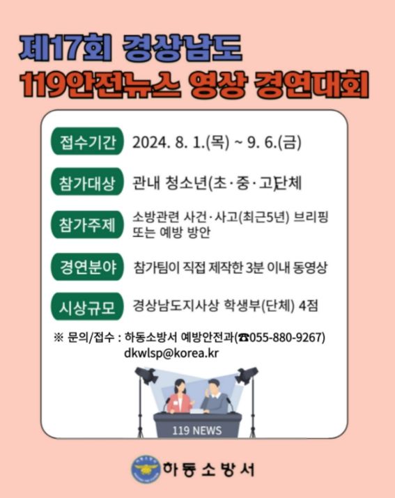 [경남도민뉴스] 하동소방서는 8월 1일부터 9월 6일까지 청소년을 대상으로 ‘제17회 경남 119안전뉴스 영상 경연대회’ 참가자를 모집한다고 밝혔다.