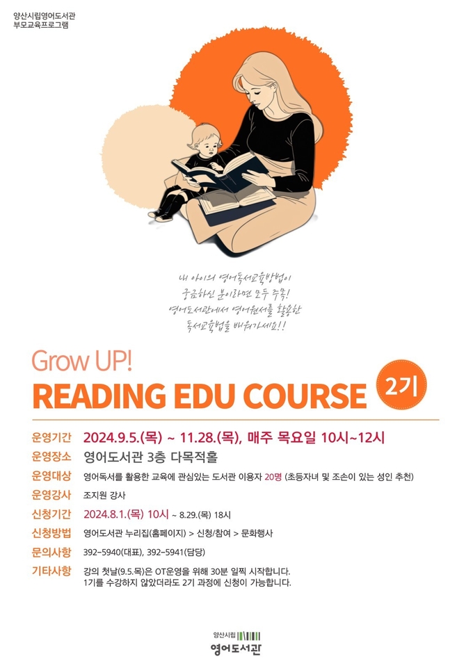 [경남도민뉴스] 양산시립 영어도서관은 오는 8월 1일 부터 영어원서를 활용한 영어독서교육법을 배워볼 수 있는 부모교육프로그램 'Grow Up! Reading Edu-Course' 2기의 참가자를 모집한다.