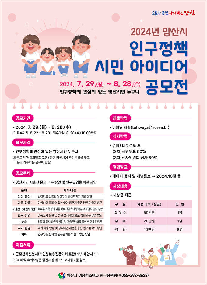 공모기간은 7월 29일부터 8월 28일까지, 접수기간은 8.22.부터 8.28.까지이며, 인구정책에 관심있는 양산시민은 누구나 응모가 가능하다. 참가를 희망하는 시민은 양산시청 홈페이지 고시/공고란 '2024 양산시 인구정책 시민 아이디어 공모전'에서 제출 서식을 받아 작성 후 담당자 이메일 (tohwaya@korea.kr)로 제출하면 된다.