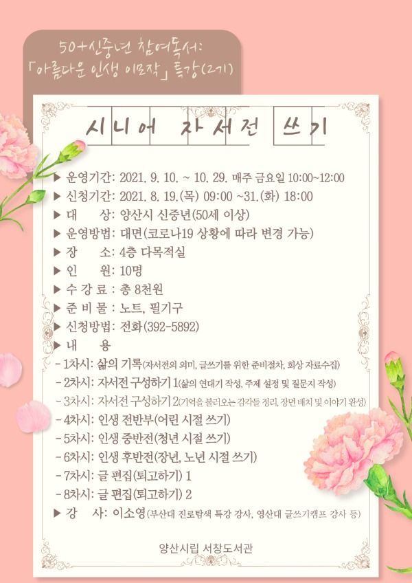 운영기간은 9.10.부터 10.29까지 매주 금요일(10:00~12:00)로 양산시 신중년(50세 이상)을 대상으로 총 8차시 운영하며, 신청기간은 8.19.(목)부터 31.(화)까지 선착순 전화 신청 가능하다.