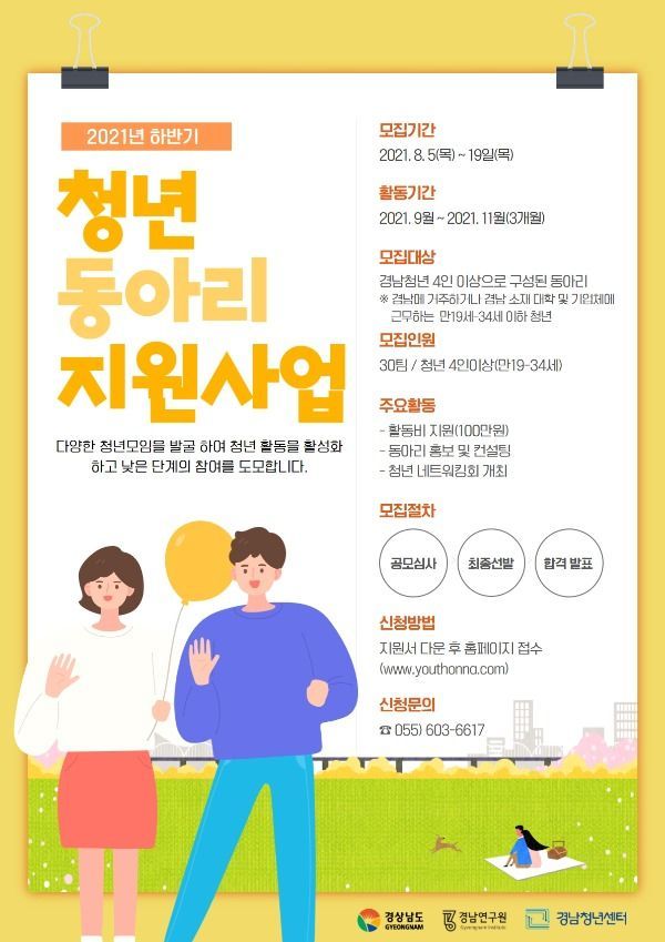 [경남도민뉴스] 경상남도와 경남청년센터는 다양한 청년 모임을 발굴・지원하기 위하여 하반기 동아리활동 지원사업 참여자를 모집한다고 밝혔다.