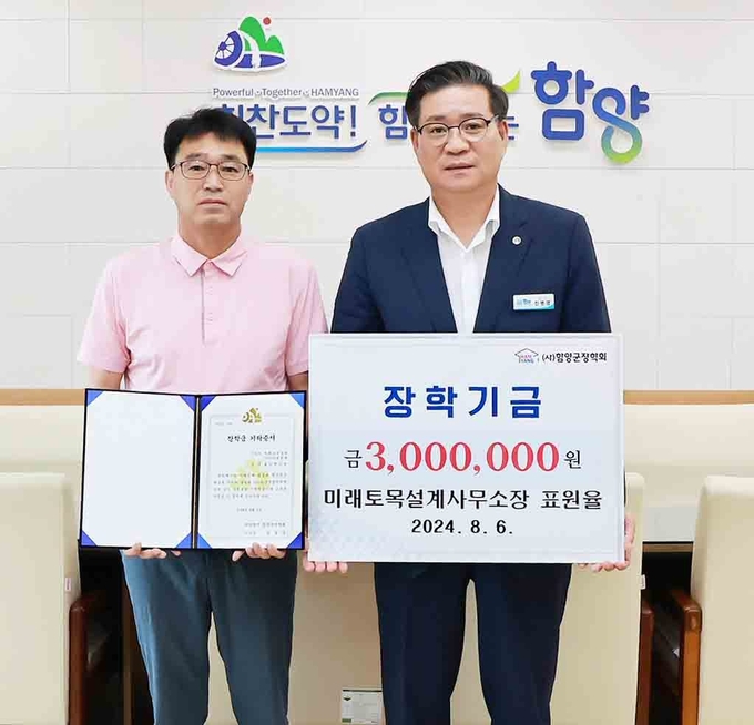 [경남도민뉴스] 함양군 지역 인재육성을 염원하는 기부 문화가 확산하고 있는 가운데 8월 6일 미래토목설계사무소 표원율 소장이 (사)함양군장학회에 장학금 300만 원을 기탁했다.