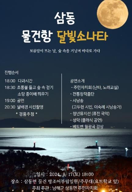 삼동면주민자치회는 오는 17일 오후 6시, 남해군 삼동면 물건방조어부림 일원에서 ‘삼동 물건항 달빛소나타’를 개최한다고 밝혔다.