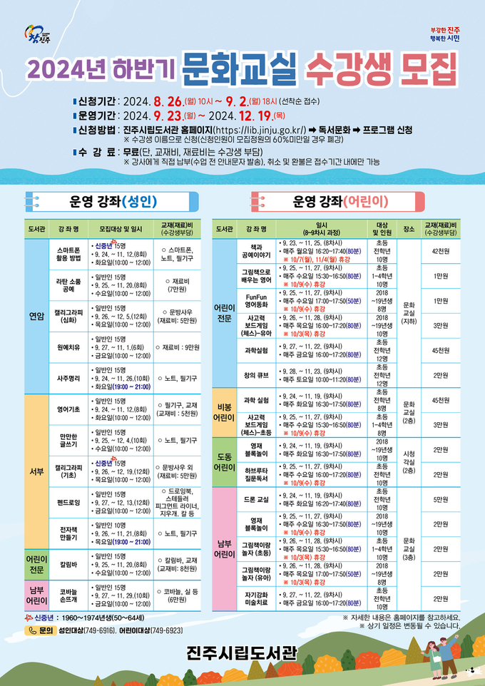 [경남도민뉴스=김종태기자] 진주시립도서관은 오는 26일부터 지역민들에게 독서문화 생활과 평생교육 기회를 제공하는 ‘2024년 하반기 문화교실’ 수강생을 모집한다.