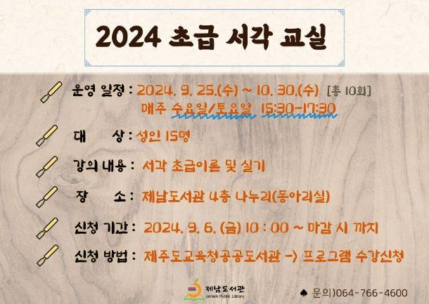 [경남도민뉴스=경남도민뉴스 기자] 제주도교육청 제남도서관은 지역주민을 대상으로 2024 초급 서각교실 수강생을 오는 9월 6일부터 모집한다.