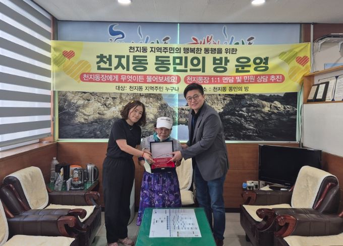 박인찬 주민자치팀장은 8월 30일 13시 천지동주민센터에서 최연자 선행동민과 면담하고, 감사패를 전달했다.
