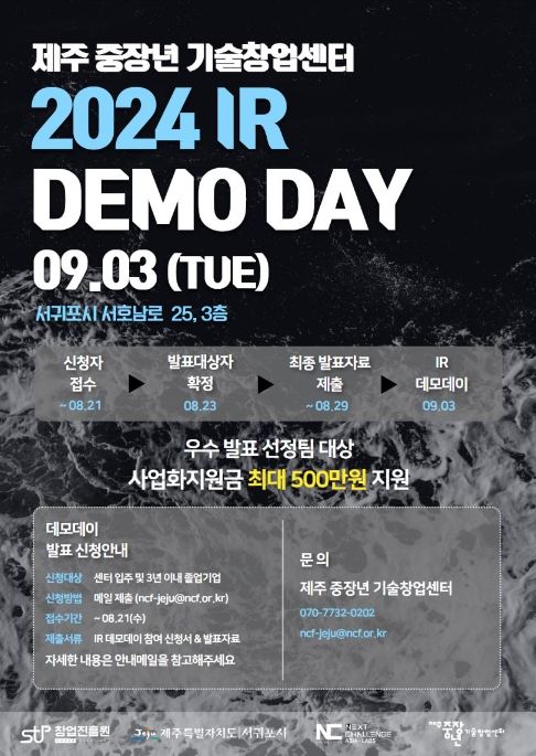 [경남도민뉴스=경남도민뉴스 기자] 서귀포시는 오는 9월 3일, 서귀포시 스타트업베이 글로벌센터에서 창업기업 사업화 및 판로개척 지원을 위한‘2024년 제주 중장년 기술창업센터 IR데모데이’를 개최한다.