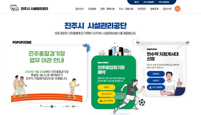 홈페이지는 공단 소개와 공지사항, 시민 참여공간 등을 기본으로 공단이 관리 운영하는 진주종합경기장 시설 이용 예약시스템을 비롯한 중앙지하도상가, 화물자동차공영차고지, 시지정게시대 이용 안내 등 공단 업무에 대해 쉽게 찾아볼 수 있도록 구성됐다.