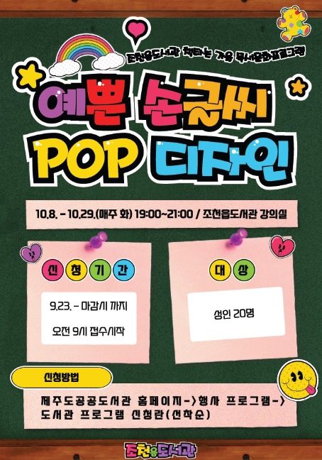 이번 강좌는 10월 8일부터 10월 29일까지 매주 화요일 저녁 7시부터 9시까지 조천읍도서관 강의실에서 운영되며, POP 디자인을 처음 접해보는 성인을 대상으로 총 4회차 초급과정으로 진행된다.