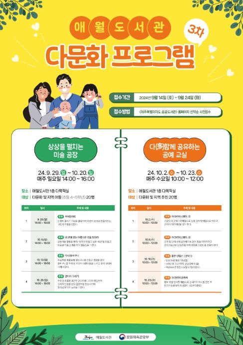 다문화 프로그램 신청은 9월 14일부터 9월 24일까지 제주특별자치도 공공도서관 누리집의 행사/프로그램에서 접수하면 된다.