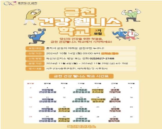 [경남도민뉴스=윤장희 기자] 금천구는 10월 4일부터 30일까지 4주 과정의 ‘금천 건강 웰니스 학교’ 2기를 운영하고 있다고 밝혔다.
