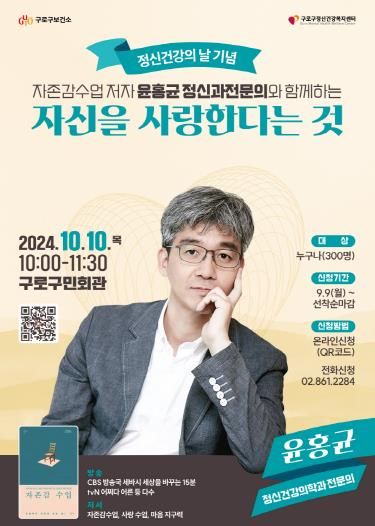 또한, 오는 10일 구로구민회관 강당에서 관내 주민 300명을 대상으로 ‘자존감 수업’의 저자 윤홍균 정신건강의학과 전문의가 ‘자신을 사랑한다는 것’이라는 주제로 정신건강 관리의 중요성을 알리고 정신건강을 지키는 방법에 대해 강연한다.