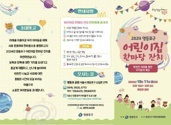 ‘한마당 잔치’는 국공립·민간·직장·가정 어린이집과 부모가 함께 소통하며 즐기는 영등포 대표 영유아 축제이다. 아이들에게는 신체적‧정서적 발달을 도모하고, 가족과 보육교사에게는 화합과 교류의 기회를 제공한다.