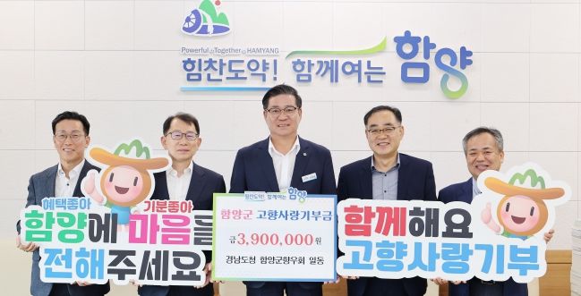 함양군 출신 공무원으로 구성된 도청 함양군 향우회는 8일 함양군청을 방문해 군 발전을 응원하는 메시지와 함께 고향 사랑 기부금 390만 원을 기탁했다.