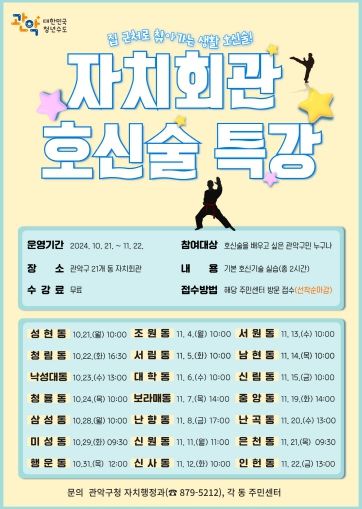 관악구 21개 동 자치회관에서 진행되는 호신술 특강은 10월 21일부터 11월 22일까지 순차적으로 진행된다. 교육을 희망하는 주민은 10월 7일부터 각 동 주민센터에서 신청할 수 있으며 선착순으로 모집한다.