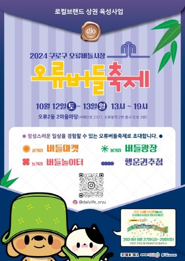 축제에 대한 자세한 사항은 오류버들시장 인스타그램에서 확인하거나 구로구청 지역경제과(02-860-3411)로 문의하면 된다.