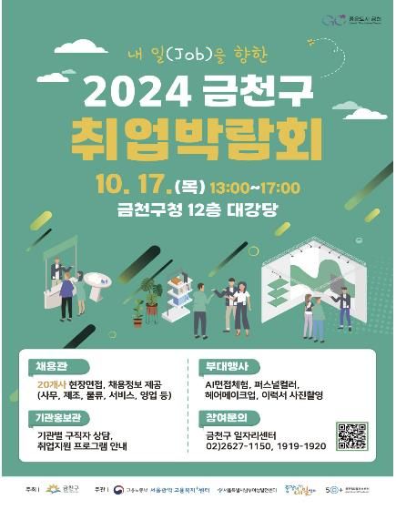 [경남도민뉴스=윤장희 기자] 금천구는 오는 10월 17일 오후 1시에 금천구청 12층 대강당에서 ‘내 일(Job)을 향한 2024 금천구 취업박람회’를 개최한다고 밝혔다.