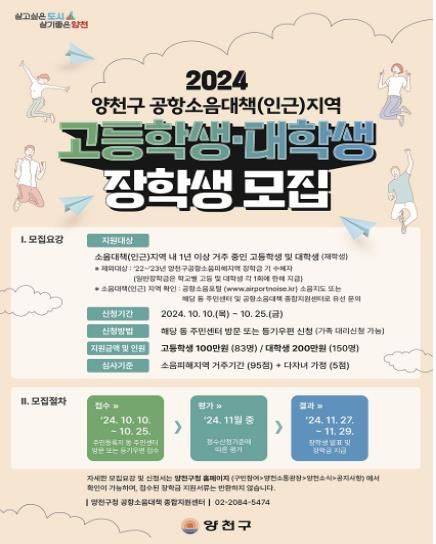 [경남도민뉴스=윤장희 기자] 양천구는 항공기 소음으로 학습권 침해를 겪는 소음대책 · 인근지역 거주 학생들의 안정적인 학습환경을 조성하기 위해 ‘공항소음피해지역 장학생’ 262명을 이달 25일까지 모집하고, 총 4억원의 장학금을 지급한다고 밝혔다.