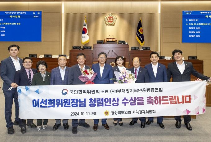 [경남도민뉴스=이돈휘 기자] 경상북도의회 기획경제위원장 이선희 의원(국민의힘, 청도)이 24년 10월 10일 국민권익위원회 소관 (사)부패방지국민운동총연합으로부터 지역사회 내 청렴성과 투명성 확산에 기여한 공로를 인정받아 청렴인상을 수상했다.