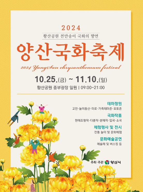 [경남도민뉴스=최미정 기자] 양산시는 ‘2024 양산국화축제’가 오는 10월 25일부터 11월 10일까지 17일간 황산공원 중부광장 일원에서 개최된다고 밝혔다.