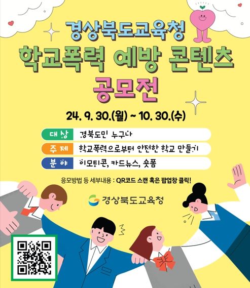 [경남도민뉴스=이돈휘 기자] 경북교육청은 30일까지 학교폭력 없는 안전한 학교문화를 조성하기 위한 ‘학교폭력 예방 콘텐츠 공모전’을 진행한다고 밝혔다.