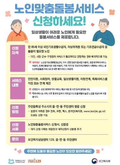 기존 대상자는 65세 이상 국민기초생활수급자, 차상위계층 또는 기초연금수급자 중 돌봄이 필요한 어르신이다.