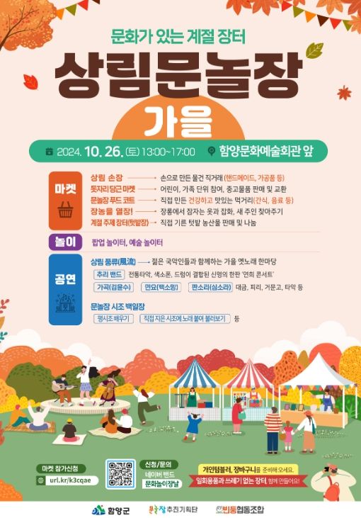 문화예술회관 관계자는 “10월 마지막 주말은 가족과 함께 풍성한 볼거리가 있는 상림 문화놀이 장날에 오셔서 장날도 즐기고, 다양한 문화축제를 느껴보길 바란다”라고 전했다.