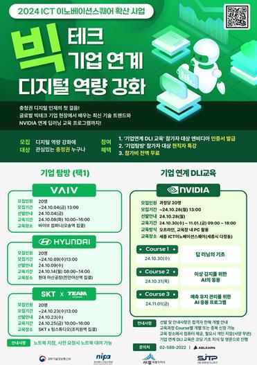 이번 프로그램은 디지털 역량 강화에 관심 있는 충청권 거주자 누구나 참여할 수 있으며, 교육 과정은 ▲빅테크 기업 탐방 프로그램, ▲엔비디아 딥러닝 기초 프로그램 등 두 가지 트랙으로 운영된다.