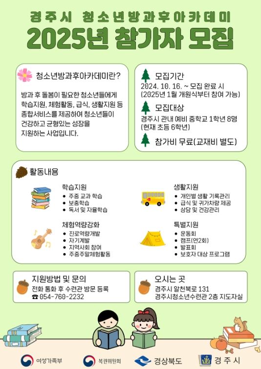 [경남도민뉴스=이돈휘 기자] 경주시청소년방과후아카데미 ‘솔찬누리화랑’이 지난 16일부터 완료시 까지 2025년 참가자 8명을 모집한다.