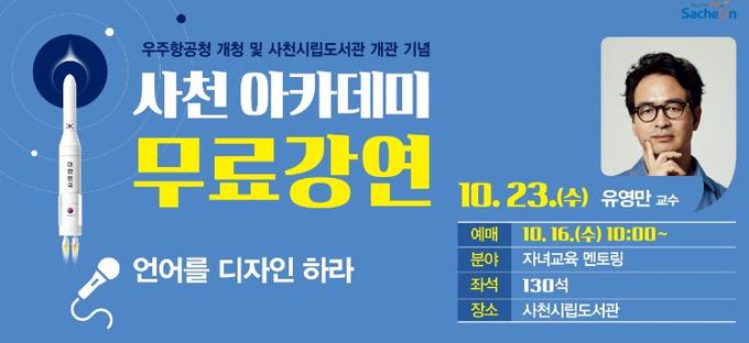 이번 강좌는 사천시립도서관 홈페이지에서 예매(1인 2매, 선착순 마감)해야 수강이 가능하다.