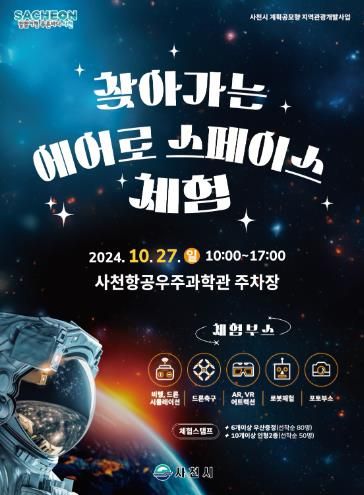 [경남도민뉴스=김종태 기자] 사천시는 10월 27일 사천항공우주과학관 주차장에서 계획공모형 지역관광개발사업으로 기획한 항공관광 컨텐츠 ‘제2회 찾아가는 에어로스페이스 체험’ 행사를 개최한다고 16일 밝혔다.