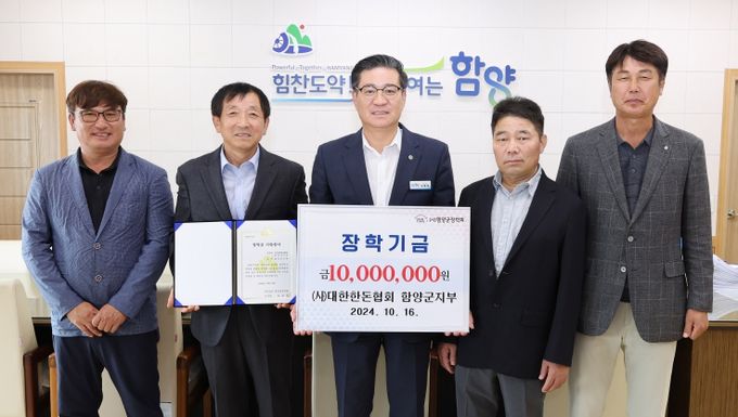 [경남도민뉴스=장광동 기자] 함양군장학회는 16일 (사)대한한돈협회 함양군지부 남기석 지부장과 회원들이 함양군을 방문해 인재 육성 장학금 1,000만 원을 기탁했다고 밝혔다.