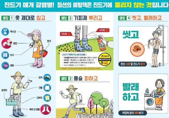 이를 위해 ▶ 야외 활동 시 긴소매, 긴바지, 모자 등으로 피부 노출 최소화하기 ▶ 휴식 시 돗자리 사용하기 ▶ 4시간마다 기피제 사용하기 ▶ 귀가 후 즉시 세탁 및 목욕하기 등의 예방수칙을 지키는 것이 중요하다.