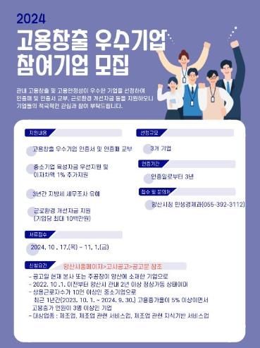 [경남도민뉴스=최미정 기자] 양산시는 양산지역 일자리 창출과 경제활성화에 기여한 ‘2024년 고용창출 우수기업’ 참여 기업을 10월 17일부터 모집한다고 밝혔다.
