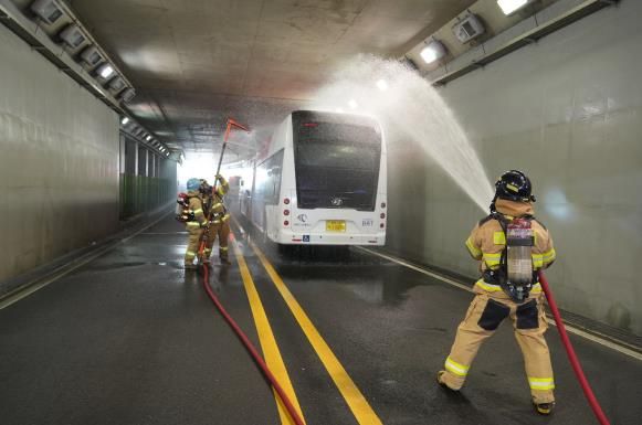 특히 지하차도 내 가득한 연기를 신속하게 빼내고 특수장비를 활용해 전기버스 상부에 위치한 배터리까지의 연소확대를 방지하는 등 지하차도와 전기버스의 특성을 반영한 훈련이 중점적으로 이뤄졌다.