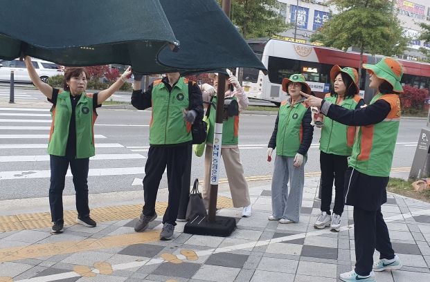 지난 16일에는 활동을 마무리하며 보행자 안전에 지장이 없도록 그늘막을 보관했다.