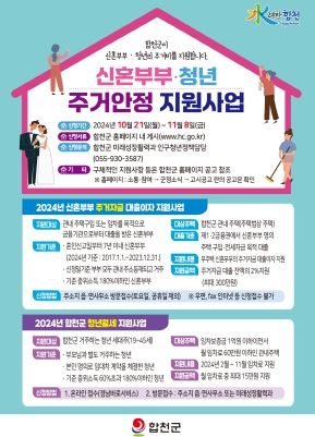[경남도민뉴스=김춘호 기자] 합천군은 무주택 신혼부부와 청년 가구의 주거비 부담 완화를 위해 ‘신혼부부 주거자금 대출이자 지원사업’과 ‘청년 월세 지원사업’을 10월 21일부터 11월 8일까지 모집한다.