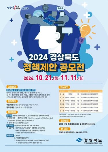 [경남도민뉴스=이돈휘 기자] 경상북도는 창의적이고 참신한 아이디어를 발굴해 도정과 제도 개선에 반영하기 위해 이달 21일부터 11월 11일까지 3주간 ‘2024년 경상북도 정책 제안 공모전’을 개최한다.