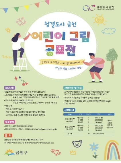구에 거주하는 초등학생은 누구나 참여할 수 있으며, 저학년부(1~3학년)와 고학년부(4~6학년)로 구분해 신청하면 된다. 신청서와 현장 사진 1장은 전자우편으로, 그림은 금천구청 청소행정과로 방문 제출하면 된다. 신청 서식은 금천구청 누리집 ‘금천소식’에서 확인할 수 있다.