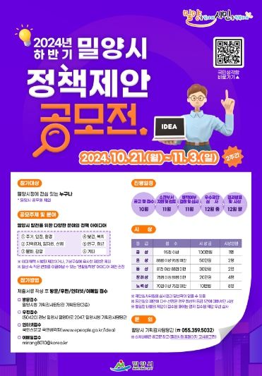 [경남도민뉴스=나희준 기자] 밀양시는 창의적이고 실용적인 아이디어를 시정에 반영하기 위해 다음 달 3일까지‘2024년 하반기 밀양시 정책 제안 공모전’을 실시한다고 밝혔다.