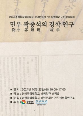 [경남도민뉴스=김종태 기자] 경상국립대학교 경남문화연구원 남명학연구소는 10월 25일 오전 10시 경상국립대 남명학관 남명홀에서 ‘면우(俛宇) 곽종석(郭鍾錫)의 경학(經學) 연구’라는 주제로 학술대회를 개최한다.