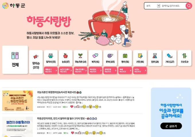 약 7개월간 3천 건이 넘은 게시글은 하루 평균 15건 이상의 글이 등록됐음을 뜻하며, 이는 지역 주민들이 하동사랑방을 활발히 이용 중임을 여실히 보여 주는 수치다.