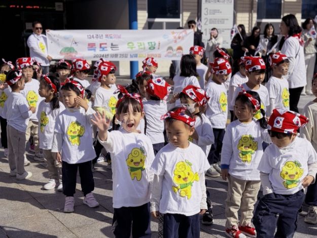 [경남도민뉴스=김부경 기자] 남해군 남해하나어린이집이 25일 오전 종합사회복지관 입구에서 70여 명의 재원 영유아와 보육 교직원, 학부모 등이 참여한 가운데 독도의 날을 기념하는 ‘독도는 우리 땅’ 플래시몹을 선보였다.