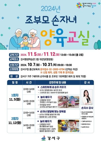맞벌이 가정의 증가로 조부모의 양육 역할이 더욱 부각되고 있는 가운데, 서울 강서구가 손자녀 양육에 어려움을 겪는 조부모들을 위해 ‘2024 조부모 손자녀 양육 교실’을 운영한다고 밝혔다.
