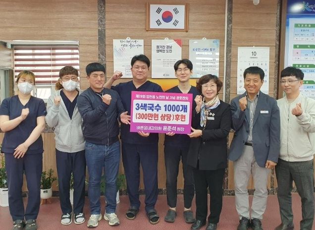 [경남도민뉴스=김춘호 기자] 합천읍 바른윤내과 의원(원장 윤준석)은 '제28회 합천읍 노인의 날 기념 경로잔치'를 맞아 합천읍 청년회(회장 곽대원)에 3색국수 1,000개(300만원 상당)를 후원했다.