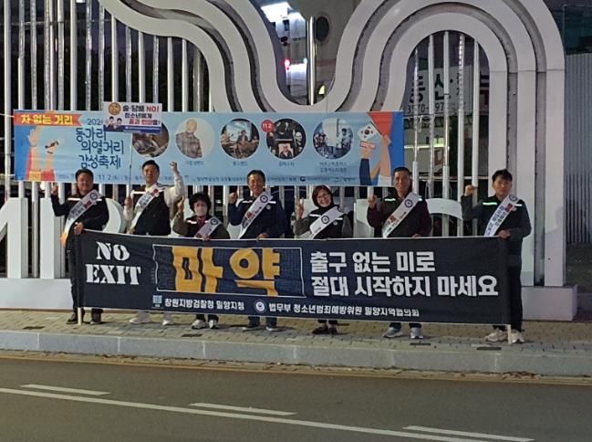 [경남도민뉴스=나희준 기자] 법무부 청소년 범죄예방위원 밀양지역협의회는 지난 29일 밀양역 회전교차로에서 청소년들을 대상으로 마약 근절 및 학교폭력 예방 캠페인 벌였다.