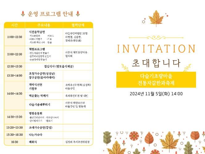 오후에는 가수 성정남과 문아카데미의 장구 공연이 이어져 풍성한 가을 정취를 만끽할 수 있는 기회를 제공한다.